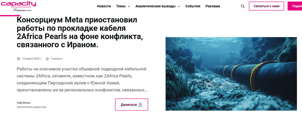 В марте 2026 года Красное море и Ормузский пролив стали настоящим кладбищем для интернет-кабелей. Там теперь такая задница, что 30% всего мирового трафика пошло ко дну. Это как будто у сети случился двойной инфаркт, потому что оба важных узла, соединяющих Европу, Азию и Африку, заблокированы. ![]() Проблема в том, что эти кабели, проложенные по дну моря, рвутся то от якорей, то от диверсий. А починить их в этих зонах теперь невозможно. Даже крупные компании типа Alcatel Submarine Networks официально заявили, что не могут работать из-за обстрелов и мин. ![]() В прошлом году похожая история была, и ремонт занял пять месяцев. Страховка стоит диких денег, да и вообще, в таких условиях никто даже не возьмется за ремонт. ![]() Amazon уже зафиксировал сбои из-за повреждения инфраструктуры. Это конкретный удар по мировым финансам, потому что триллионы долларов проходят через эти кабели каждый день. Для биржевых роботов даже миллисекунда задержки – это огромные убытки. ![]() Что нам это сулит? Если кабели в Красном море окончательно порвутся, интернет может распасться на куски. Трафик пойдет в обход через Тихий океан, и тогда даже почту будет загружать целую вечность. Короче, физическая деградация мировой сети налицо. ![]() Так что, готовьтесь, скоро, возможно, будем снова писать письма от руки, читать бумажные газеты и видеться с коллегами вживую. P.S.: Вот это да! Представьте себе, один американец придумал такой необычный способ передачи данных: он прикрепил к лапкам голубя целых три флешки по 1 терабайту каждая и отправил птичку примерно на километр. Получилось как в старые добрые времена, только наоборот! Голубь, который, как известно, летает быстро, справился с задачей буквально за минуты. А вот если бы он решил отправить такой же объем информации через интернет, ему бы пришлось ждать очень долго, потому что процесс только-только начался бы. Видео про этого американца: